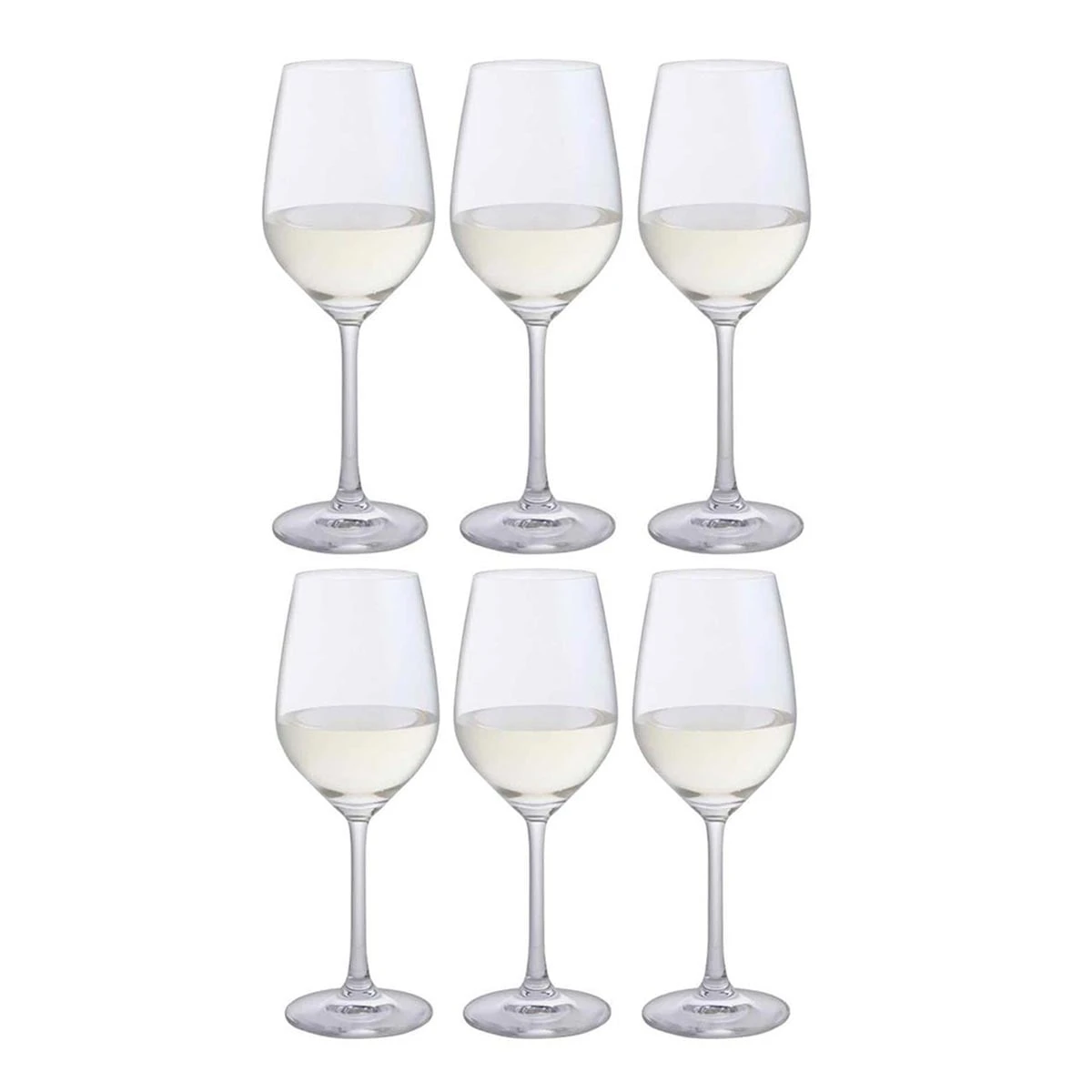 Set of six elegant white wine glasses that will add to your drinking pleasure. An ideal choice for any occasion or as a gift.
