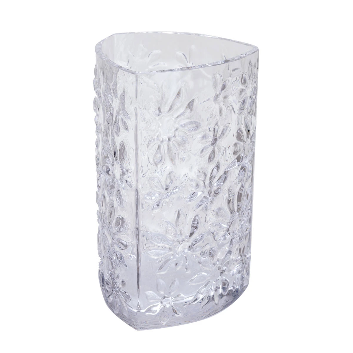 The vase’s proportions make it an ideal centerpiece for both residential and commercial spaces. Each of the three expansive walls features intricate floral imprints, showcasing exceptional attention to detail. The transparency of the glass allows for an unobstructed view of these textures.