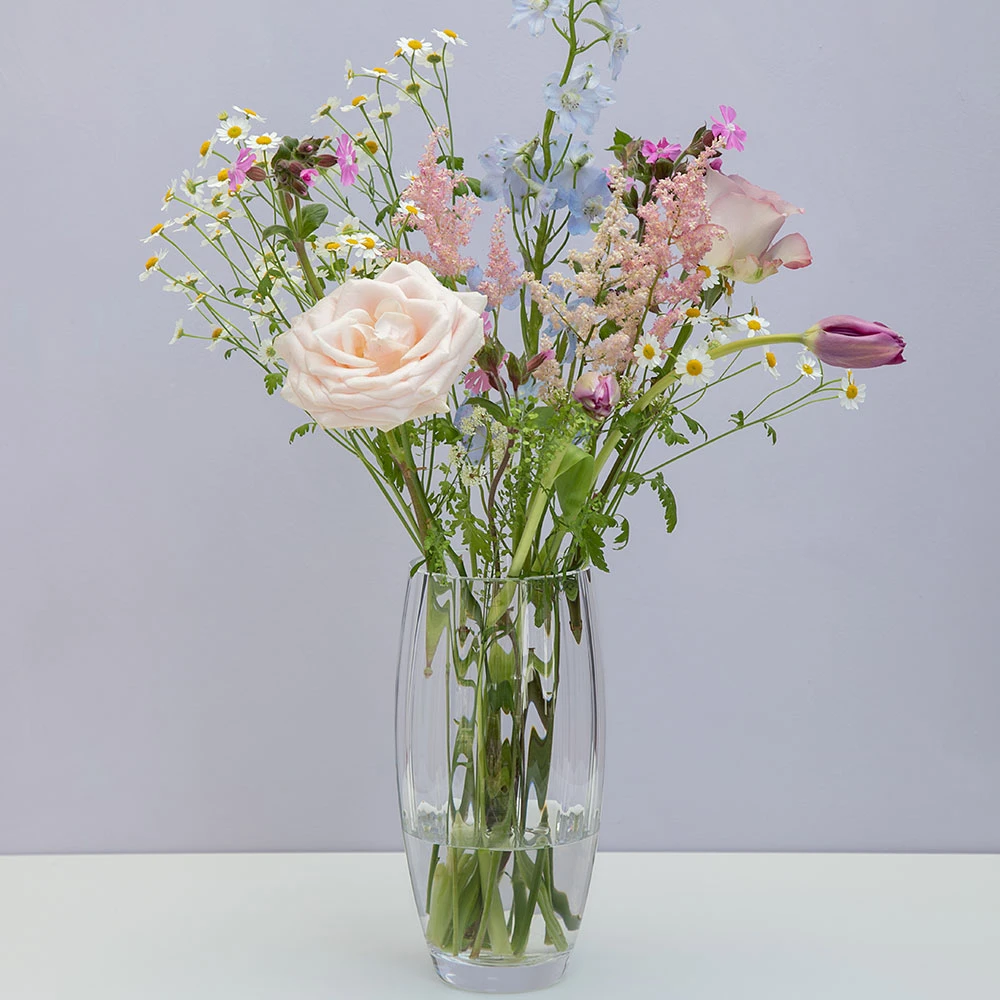 The gently curving profile of this vase supports long stemmed varieties to their best effect.